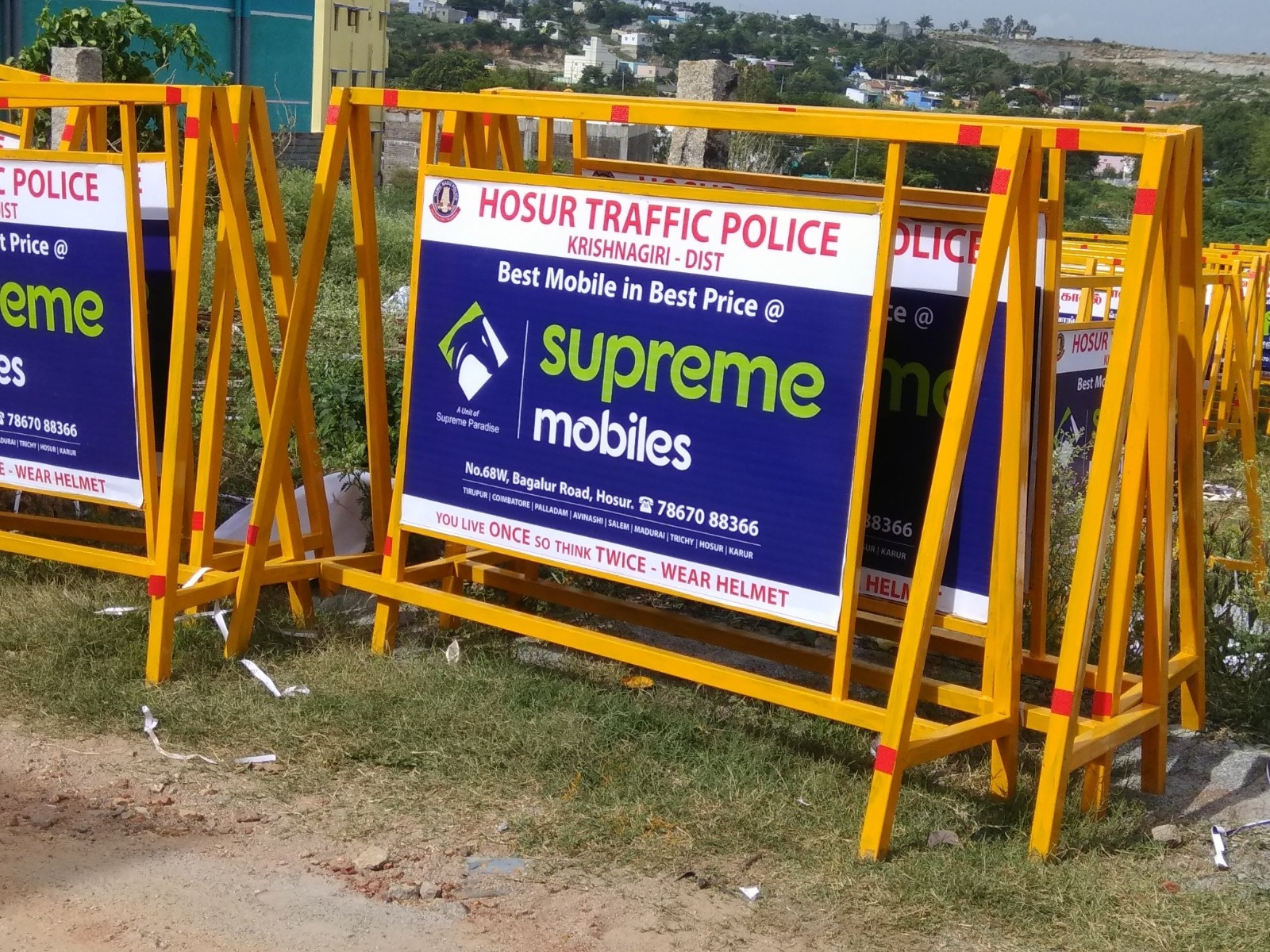 A traffic barricade stands resolutely at the intersection, its bright orange hue and reflective stripes warning drivers to slow down and navigate carefully around the construction zone ahead.